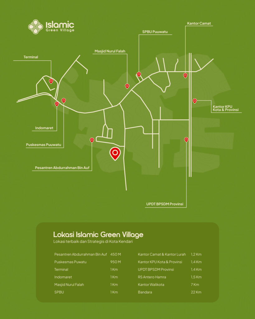 Islamic Green Village berada di Lokasi strategis di Kota Kendari, berjarak hanya 500 Meter ke Jalan Utama Prof Muh. Yamin – Puwatu